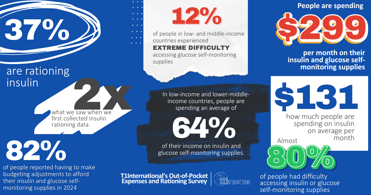 This study highlights the significant financial burden that people with type 1 diabetes face in the absence of full healthcare coverage and associated rationing of insulin and other diabetes supplies. Even in this sample of participants from mostly high-income countries, over a third rationed insulin and glucose self-monitoring supplies.
